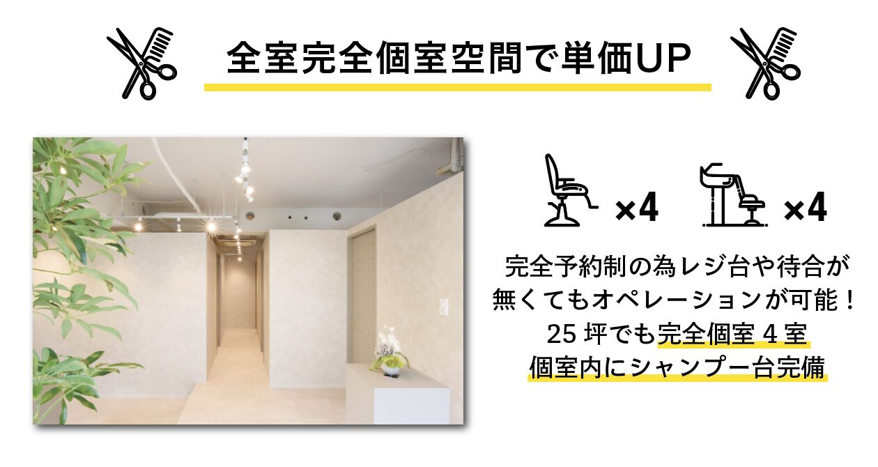 集客は全てWEB上で行うことから、家賃が抑えれる2Fテナントを選択。セット面は全席個室空間で、レジ台も、待合いも無く全てを個室内で完結。
